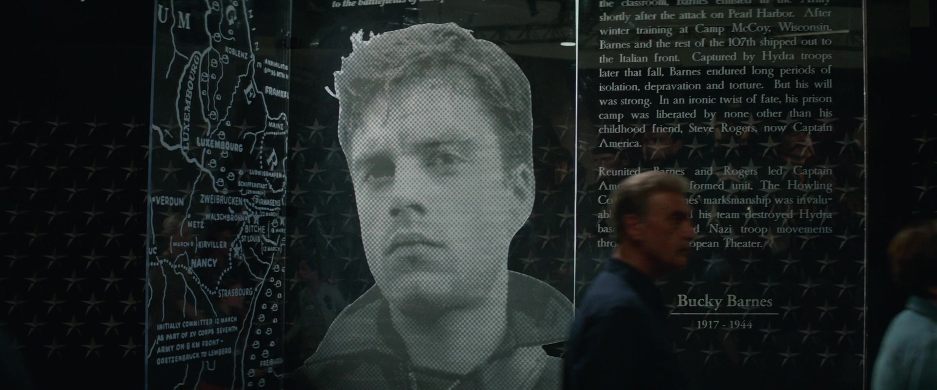В музее, на экспозиции, посвященной Капитану Америке, был стенд , где рассказывалось о жизни Баки.