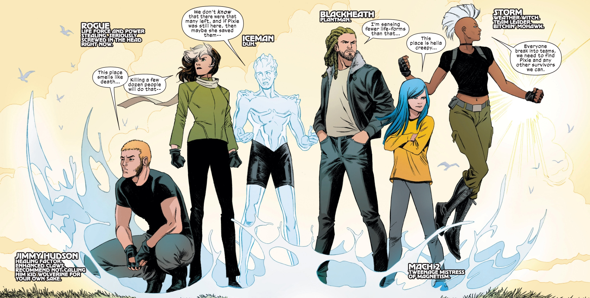 Но в этот момент на помощь мутантам прибыл Рик Джонс, ставший новым Капитаном Марвелом. Несмотря на то, что группе мутантов удалось разобраться с целым роем противников, они спасаются бегством от оставшийся Га Лак Тусов, спрятавшись в подземелье. Однако, армия роботов обнаружила их, и отравила Джимми, но того спасла Роуг, но один из них убивает Пикси, однако, она перед смертью, отдает свои последние силы Мэриан, чтобы спасти Людей-Икс, и та переносит мутантов обратно на Землю, однако Рик остался, чтобы уничтожить Га Лак Тусов.