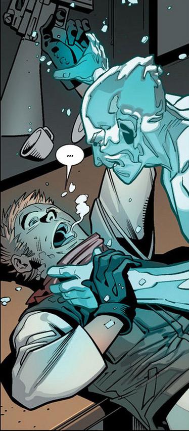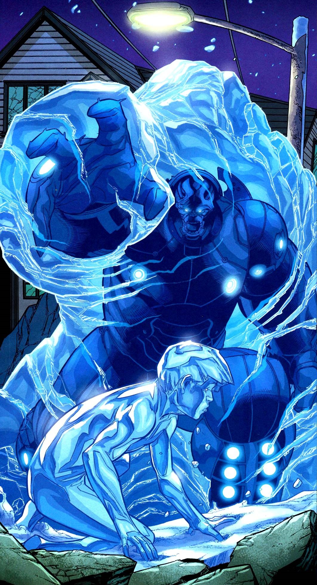 - Ледяная форма. Температура тела Бобби несколько ниже температуры обычных людей, но он способен понижать ее еще сильнее, из-за чего его тело полностью покрывается льдом. Лед защищает Бобби от физических повреждений.